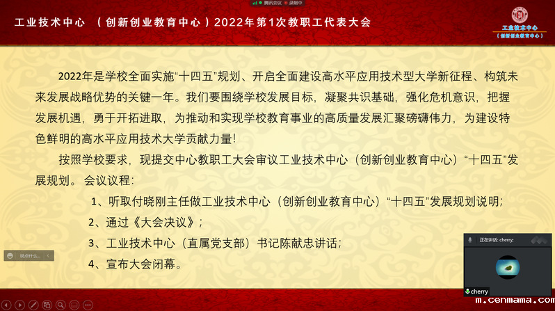 2022年是学校全面深入推进实施“十四五”规划、开启全面建设高水平应用技术型大学新征程、构筑未来发展战略优势的关键一年。为适应新形势,工业技术中心(创新创业教育中心)于5月11日下午在腾讯会议平台召开2022年第1次教职工代表大会, 此次大会中心31位教职工全体参会。